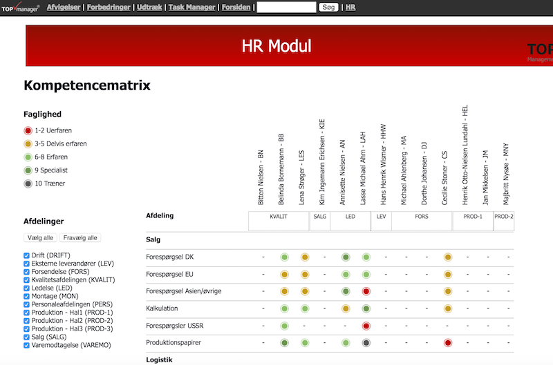 Der kan der trækkes kompetencematrix ud på alle brugere (med undtagelse af gæst-niveau), hvor de enkelte værdier er omsat til farver.